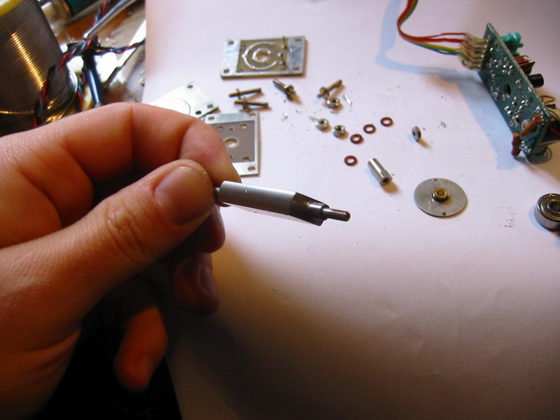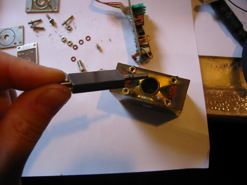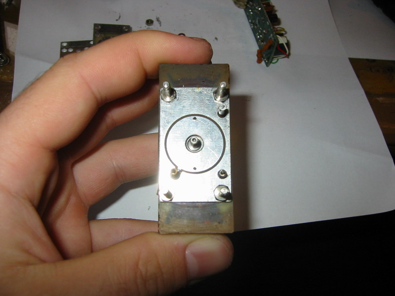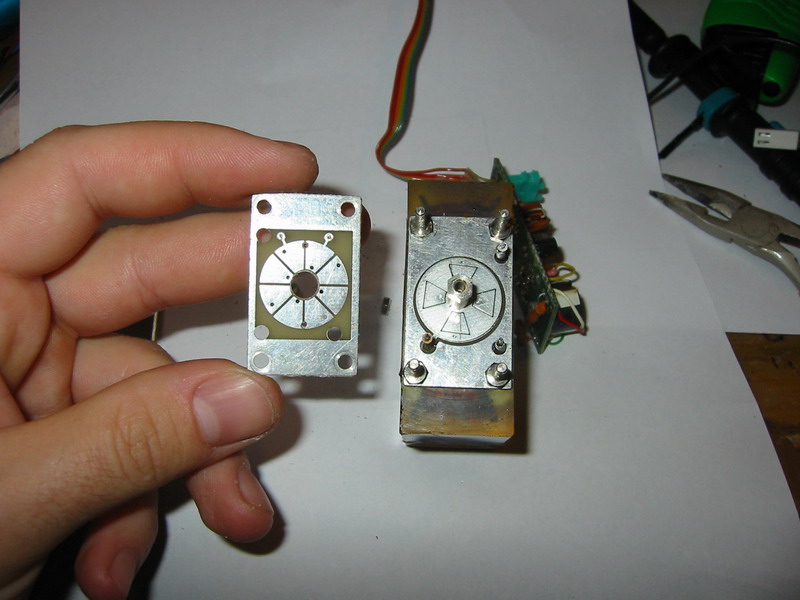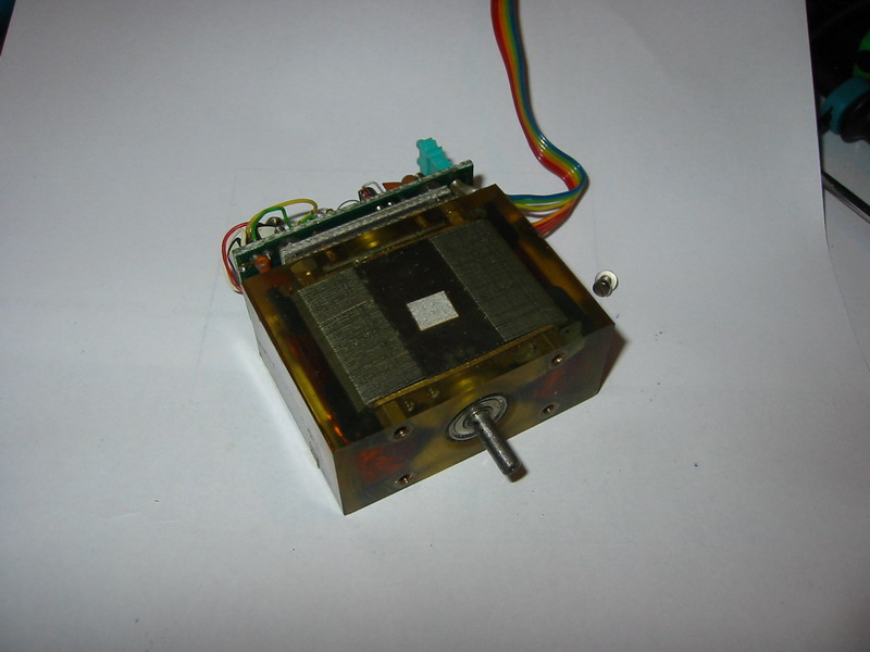 A szkennert szétszedvén nagyokat álmélkodtam... A szekenner inkább a robosztusság és az erő példaképe, mint a gyorsaságé, ennek ellenére elég jól kivitelezett dologról van szó. Gyorsaságáról csak annyit hogy határ frekvenciája kb 200Hz körül van, de 200Hz-el még egy elefántot is megtudna rángatni az ormánya körül... :) Gyakorlatilag kimondottan nagy tükrökkel használta ezt a szkennert a Lézerszínház, és annak idején, még pár betűs szavakat is ki tudtak vele írni. Az ereje akkor lepett meg mikor egy kis erőkart raktam rá és bekapcsoltam. Beálláskor akkorát oda vágott az ujjamra, hogy felszisszentem. Iszonyú erős a szkenner!! 0,5A es meghajtással gyakorlatilag nem lehet lefogni semmilyen módon. Köszönhető ez a Neodímium állandó mágneseknek, az iszonyú nagy vasmagos tekercseknek, és a számomra is elcsodálkozásra méltató óriási forgórésznek. A forgórész súlyát sajnos nem állt módomban megmérni, de kb 70-80gramm körül lehet. Csúzliba téve akár még veszélyes is lehet. Szóval a szkenner felépítése a klasszikus elvet sugallja, két állandó mágnes, két vasmagos tekercs, középen pegig egy lágyvas forgórész. A tekercsek ellenállása együttesen 20 Ohm!