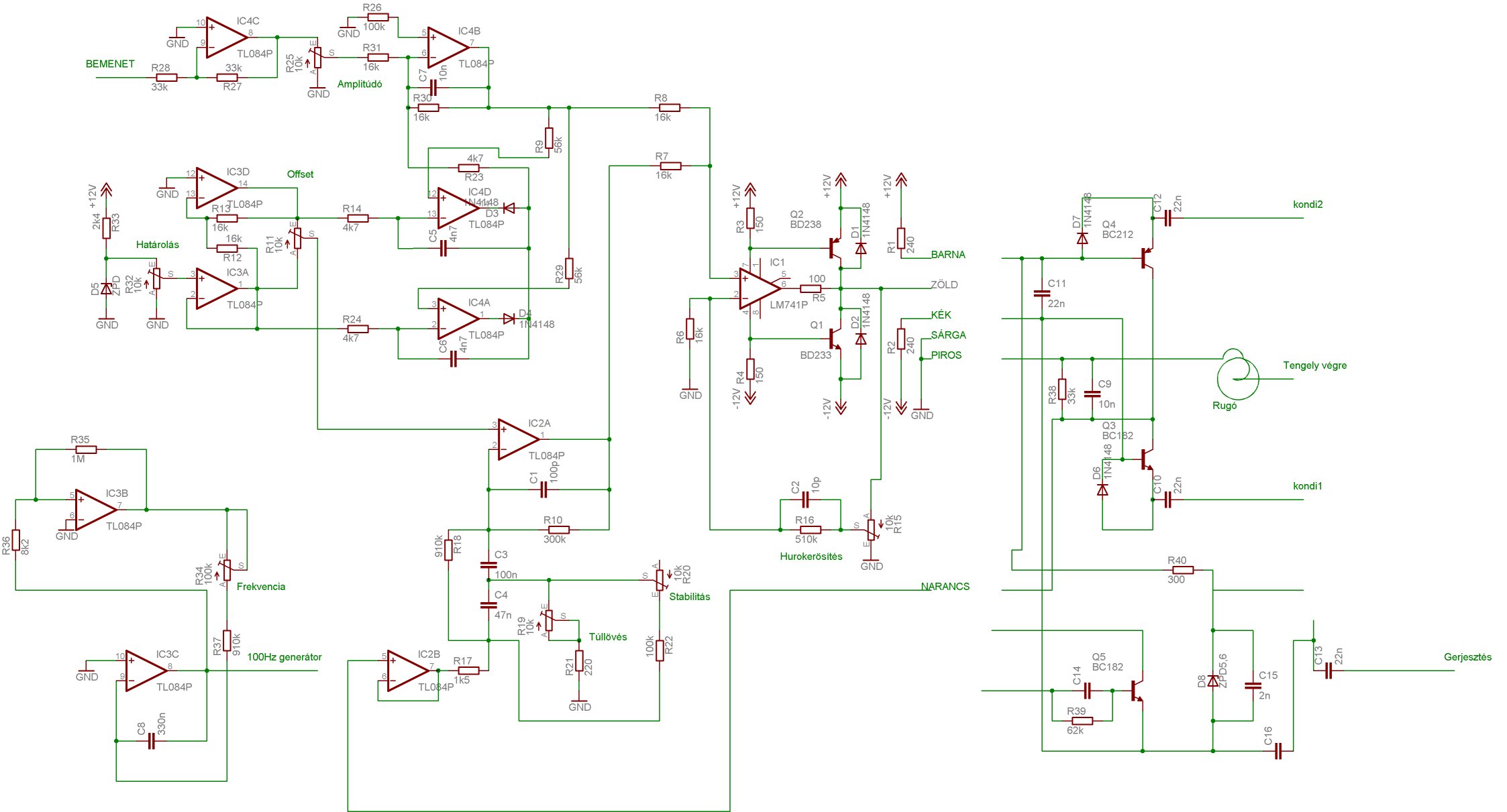 A magyarországi Elektronikai Műszaki Fejlesztő Kisszövetkezet annó 1987-ben gyártotta ezt a szkennert. A Lézerszínházból sikerült hozzá jutnom egy minta darabra, melyen bátran gyakorlazozhattam, és tanulhattam. A szkenner működésének megértését az elektronika visszarajzolásával kezdtem, mivel semmilyen formában nem állt rendelkezésünkre semmilyen kapcsolási rajz, illetve forrás. Hosszas bíbelődés után végül sikerült vissza fejteni a kétodlalas nyákra készített kapcsolást, mely tartalmazott néhány "zsák" áramkört is a lelkes amatőrök számára :) Amúgy ezek a zsák áramkörök valószínűleg a további fejlesztés, és módosítás, és beállítás szerves részei, mégis az alkatrészek 1/4de csak "dísznek" van a huzalozott áramkörön, sehová nem menő kondenzátorok és önmagába visszacsatolt IC-k sokasága gyülekezik a panelon. Ám egy használaton kívüli áramkörre mégiscsak figyelmes lettem!!!! Mégpedig egy zseniálisan nagyszerű fűrész generátort rejtettek el a tervezők a panelen, ami a beállítást hivatott elősegíteni. Teljesen egyszerűen csinálhatunk az egyik csatornából oszcilloszkópot, imígyen a másik csatornára négyszögjelet adva, mindenféle műszer nélkül zseniálisan be lehet állítani a szkenner túllövését, gyorsulását és erősítését!