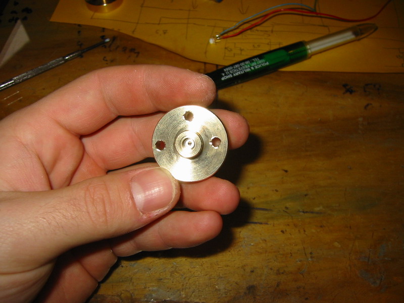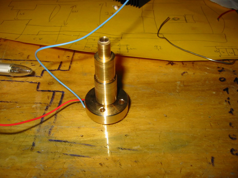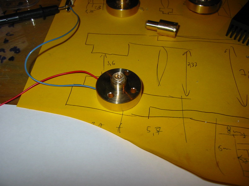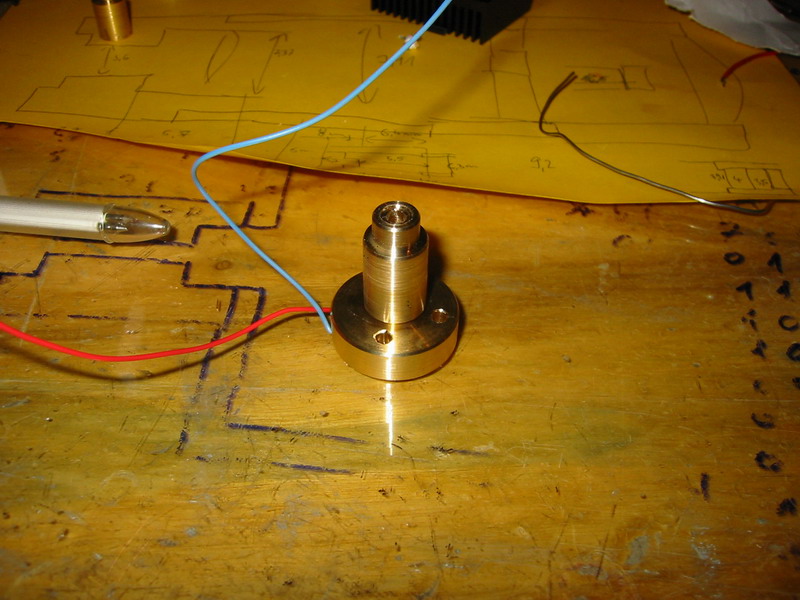Ha a második tag is elkészült, akkor lehet próbálgatni a két tagot összeilleszteni, bekapcsolt dióda mellett! FONTOS, hogy soha de soha ne nézzünk bele a készülő lézerbe, még akkor sem, ha nem jön ki zöld fény! Bekapcsolt dióda mellett nagyjából 250mA meghajtással, már ki kell tudjon jönni a zöld fény. Húzzuk rá a kristályos tagot a dióda alapra, és óvatosan mozgassuk, billegtessük, tologassuk a kristály befogót, míg meg nem jelenik a fény! Amikor megjelent a fény, vegyük lejjebb a meghajtó áramot, és próbáljunk megint erősebb fényt kicsikarni. Ezzel a jusztálással, ha türelmesek vagyunk, nagyon jól be lehet állítani a lézert! Nagyon fontos, hogy a próbálgatás közben még csak véletlenül se menjünk fel a dióda áram és feszültség határértékei fölé! Vigyázat! Itt még nem lesz pontszerű és nagyon éles a fénypont! Inkább egy nagyobbacska gyengébb folt lesz úgy 1-2 méteres távolságban. Elképzelhető, hogy lesz ezen kívül még két mellék nyaláb is, ezektől nem kell megijedni, majd a következő elem kitakarja. Addig állítsuk, míg egy szép kerek foltot nem kapunk a közepén. Ha ezzel készen vagyunk a első és a második tagot rögzítsük egy kis epoxyval! Közben járassuk a lézert, és figyeljük, hogy nem állítódik el a ragasztó száradása közben! Amíg nem köt meg a ragasztó teljesen, addig állítsunk utána, hogyha nagyon elállítódik a lézerünk! Ebben az állapotban várjuk meg a ragasztó teljes megszáradását! A hűtés elméletileg elegendő a lézernek azzal a sárgaréz befogó pogácsával, de a beállítás közben és a ragasztgatás közben inkább szakaszosan üzemeltessük! Ha kész van a lézer e része, akkor jöhet a nyalábrendezés. A legutolsó kollimáló lencsével lehet beállítani a nyaláb párhuzamosságát. Ehhez is alább lehet megtalálni egy javasolt rajzot, a lényeg hogy a távolsággal kell addig játszani, míg a lézer sugarunk kb. 5 méteres távolságban el nem éri a legjobb párhuzamosságot, azaz a fénypont a legkisebb nem lesz.